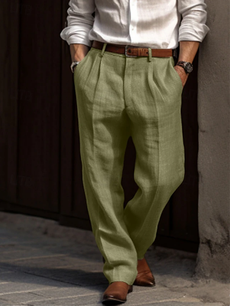 Gênero: Homens Tipo de Calça: Calça verão, Calças Plissadas, Calças de linho, Calças, Calças sociais Estilo: Básico, Moda Ocasião: Feriado, Diário, Casual Tecido: Misto de Algodão e Linho Detalhes: Bolso frontal, Perna reta Tipo de Cintura: Cintura Média Função: Conforto, Respirável Corte da Peça: Normal Tipo de mosca: Botão Estampa: Tecido Estação: Primavera Verão
