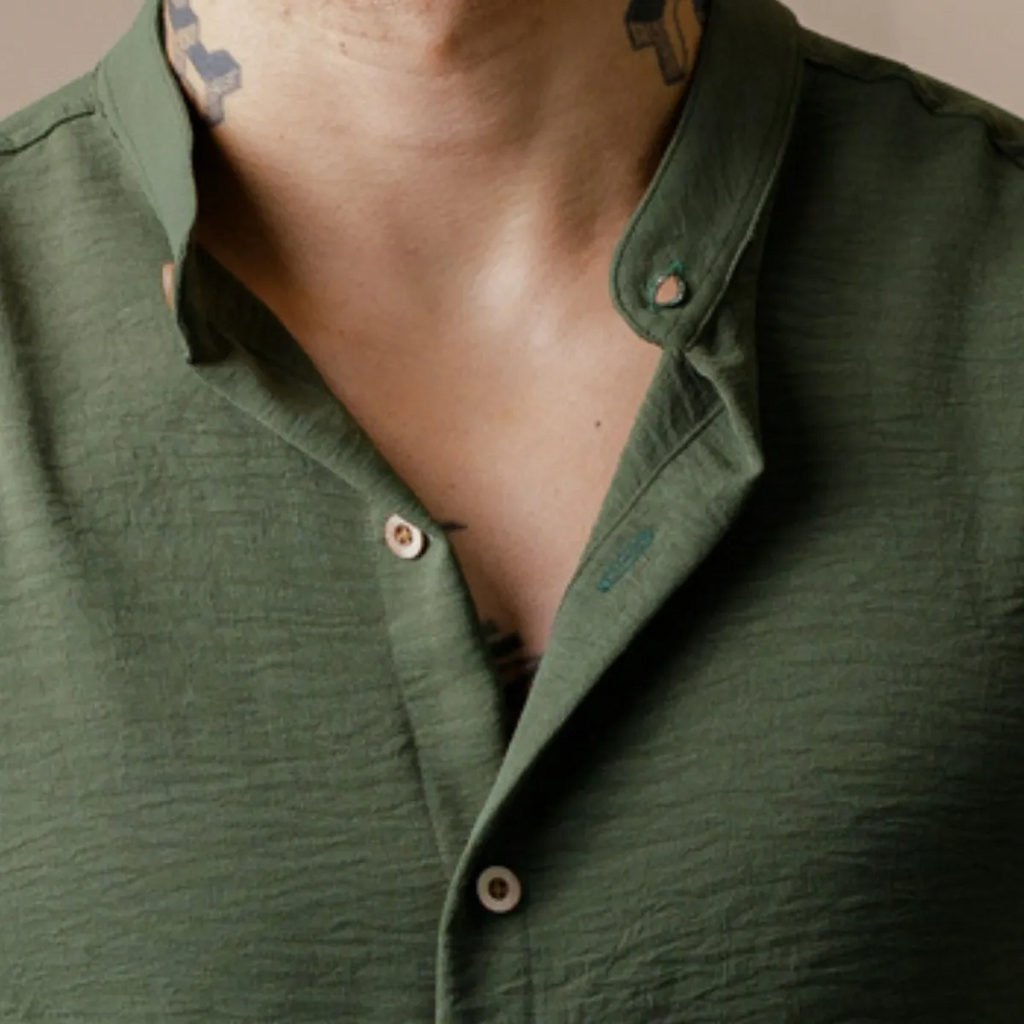 • Camisa: poliéster leve e durável, com gola padre para um visual diferenciado. Fechamento frontal com botões e mangas curtas soltinhas.