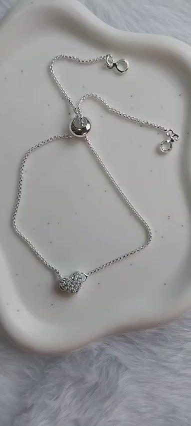 Surpreenda-se com a delicadeza e o brilho desta pulseira Prateada com um design regulável que oferece conforto e ajuste perfeito. apresenta um detalhe encantador em formato de coração cravejado com zircônias redondas, além de elegantes ponto de luz que complementam o visual com sofisticação.
